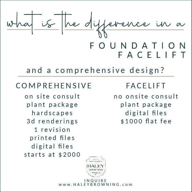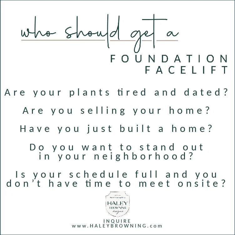 My Foundation Facelift service offering focuses on the foundation plantings around your home. It is a quick and easy way to get a plan for you to work from if you are a DIYer or for you to pass off to your landscape contractor to install.